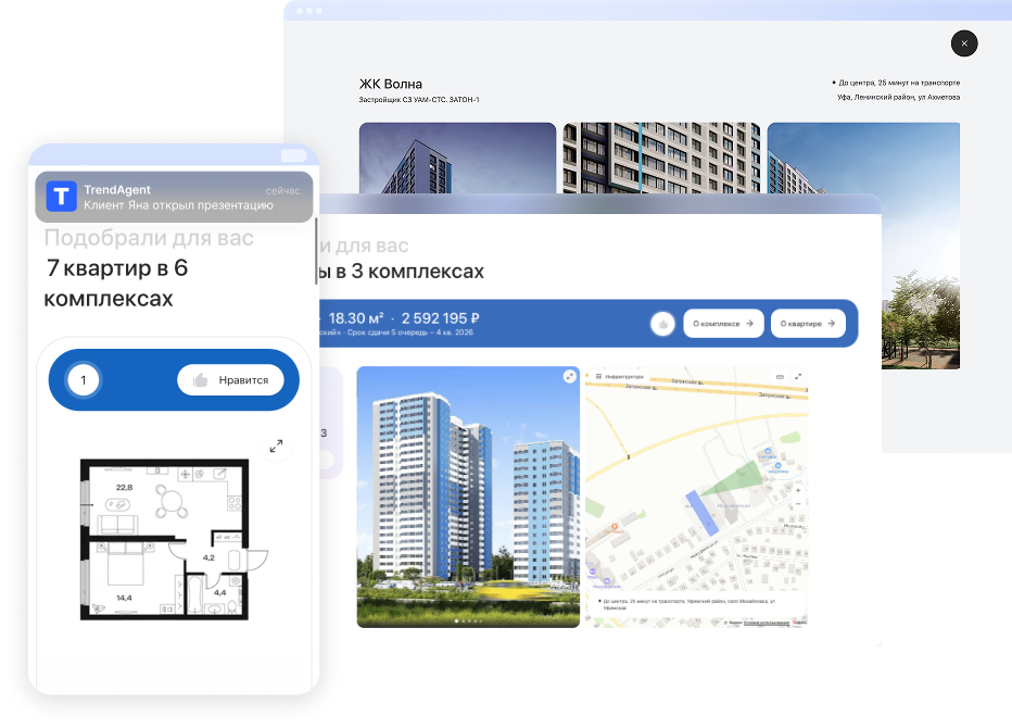 Создавайте эффектные подборки объектов за несколько кликов. Клиент получит актуальную и впечатляющую презентацию, а вы сэкономите время и подчеркнёте свою экспертизу.